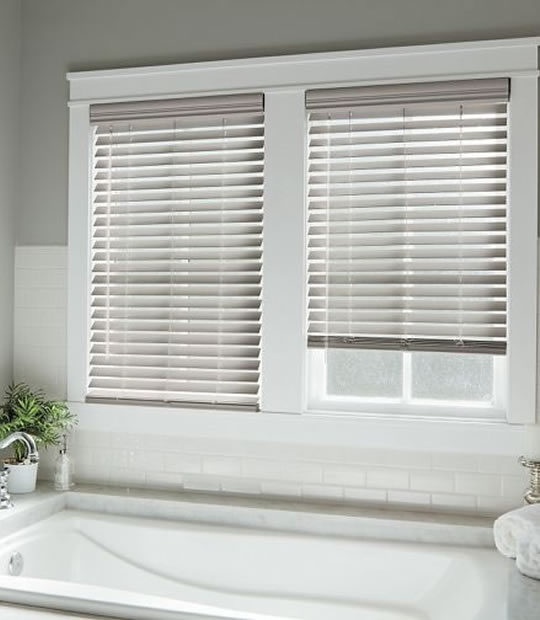 Moisture-resistant faux wood window blinds ideal for kitchens and bathrooms