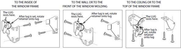 If the clutch is on the right end of the shade, attach the brackets to the window frame, window molding, wall or ceiling, as sh own below. If the clutch is on the left end of the shade, reverse the bracket positions, left for right.